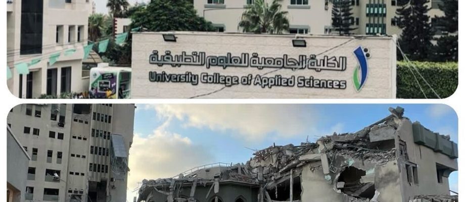 The main headquarters of the University College of Applied Sciences in Gaza City was subjected to widespread destruction that affected all the main buildings, during the barbaric genocidal war waged by the occupation army on the Gaza Strip for more than ten months, which has left tens of thousands of martyrs, wounded and displaced. The Israeli occupation army had destroyed in stages a group of the main buildings of the University College of Applied Sciences, namely the female students’ building, the vocational diploma building, the Kuwait Development Center building and the technology incubator, in addition to destroying a number of floors of the administration building and the student building with warplane missiles. This is in addition to the complete and systematic destruction of the infrastructure of the University College of Applied Sciences and its various facilities, classrooms and various specialized laboratories, which is classified as the first of its kind and the most modern at the level of Palestinian universities. It is worth mentioning that this deliberate targeting of the buildings and assets of the University College of Applied Sciences comes at a time when the Israeli occupation army is targeting all elements of life for the people of the Gaza Strip, in an attempt to bring this people to their knees and undermine their determination, in light of the impotence of international organizations and advocates of freedom and justice. Despite the enormity of the tragedy, the University College of Applied Sciences is determined to continue its noble mission in serving the Palestinian society, and is preparing to launch the new academic year according to the available capabilities, because it fully believes that the first step in the march of liberation begins with education.